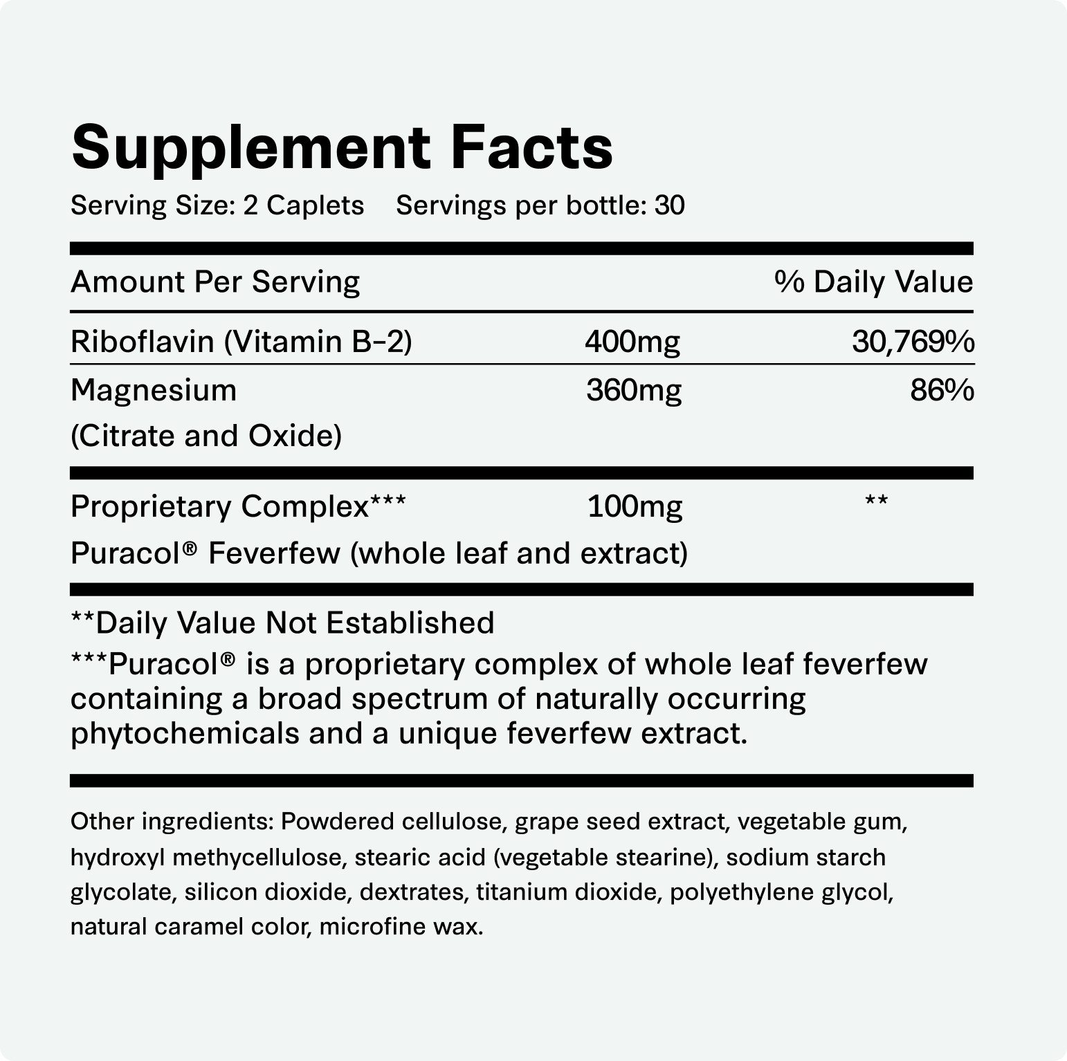 - Clinically Studied Ingredients: Formulated with magnesium, riboflavin, and Puracol® Feverfew—ingredients backed by scientific research.